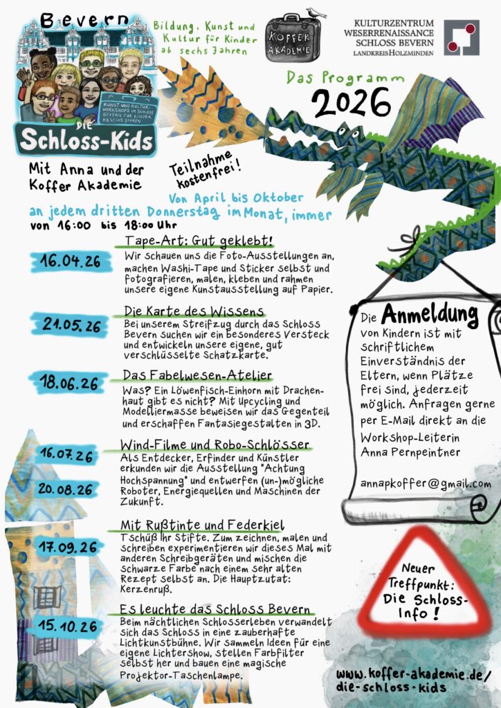 Das Programm für die Schloss-Kids ist ein kostenfreies Angebot zur künstlerischen und kulturellen Bildung für Kinder ab sechs Jahren in Bevern. Die Workshops finden in der Regel von April bis Oktober an einem Donnerstag im Monat statt, jeweils von 16:00-18:00 Uhr. Treffpunkt für Kindergruppen: Schlossinformation im Weserrenaissance Schloss Bevern.
